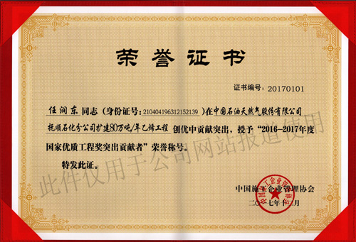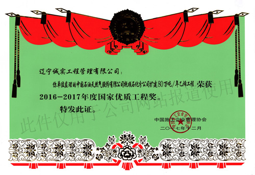 2017年11月10日,根据中施企协字【2017】66号文件——《关于表彰2016-2017年度国家优质工程奖的决定》公告,我单位所监理的“中国石油天然气股份有限公司抚顺石化分公司扩建80万吨/年乙烯工程”荣获2016-2017年度国家优质工程奖,该项目总监“任润东”还获得了“2016-2017年度第二批国家优质工程奖突出贡献者”的荣誉称号。