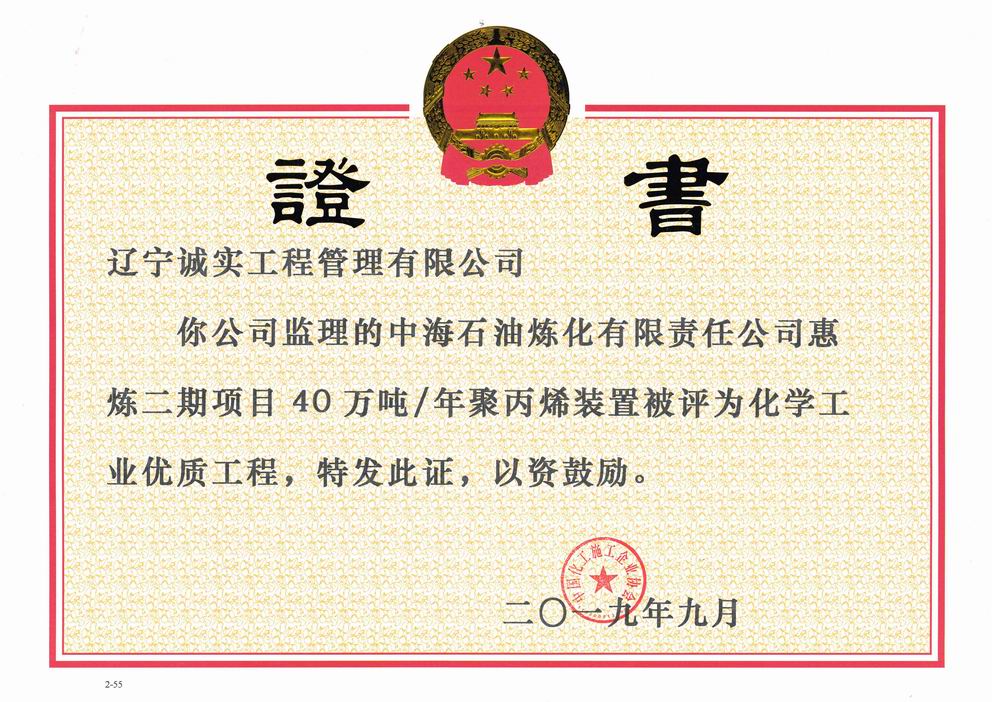 2019年9我单位所监理的“中海石油炼化有限责任公司惠炼二期项目40万吨/年聚丙烯装置”被评为化学工业优质工程奖